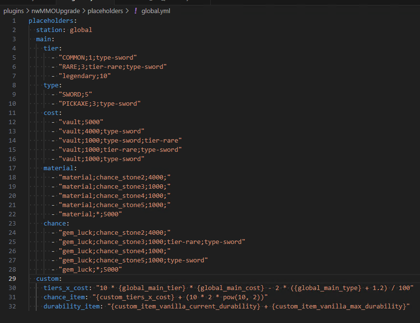 The **custom** section allows you to define your own formulas that can be used in other parts of the system.